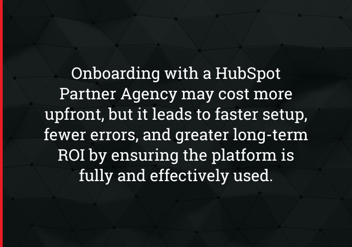 At first glance, onboarding with a HubSpot Partner Agency may seem more expensive. However, the long-term value of faster implementation, customized setup, and higher ROI balances out the upfront cost.